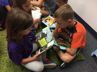 During reader's workshop, we continue to practice discussion techniques. In these photos, you can see the "Fishbowl" strategy. The first two children shared their feelings about a character or moment in the story, and decided if they agreed or disagreed. Then, a third person entered the conversation!